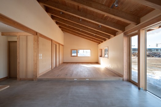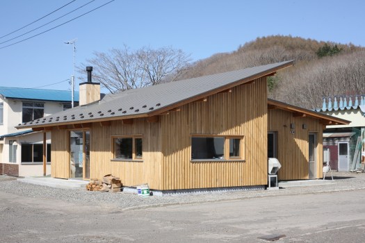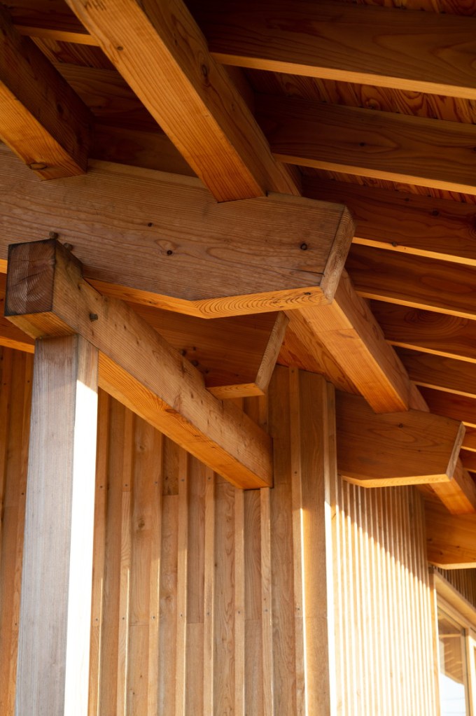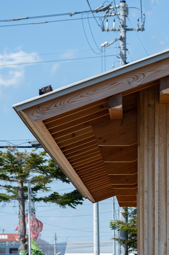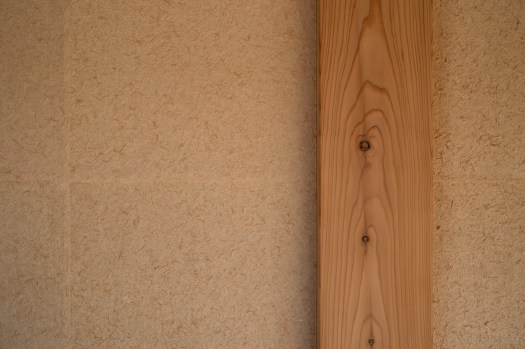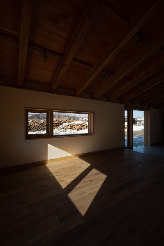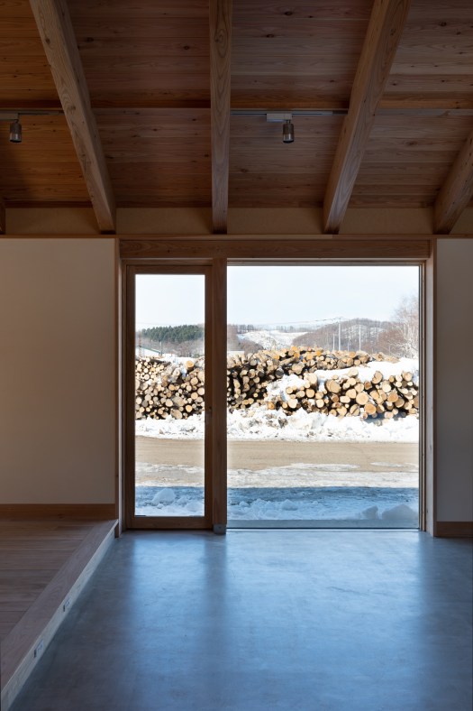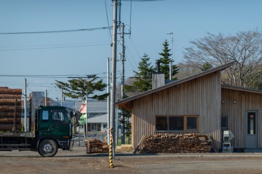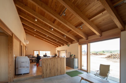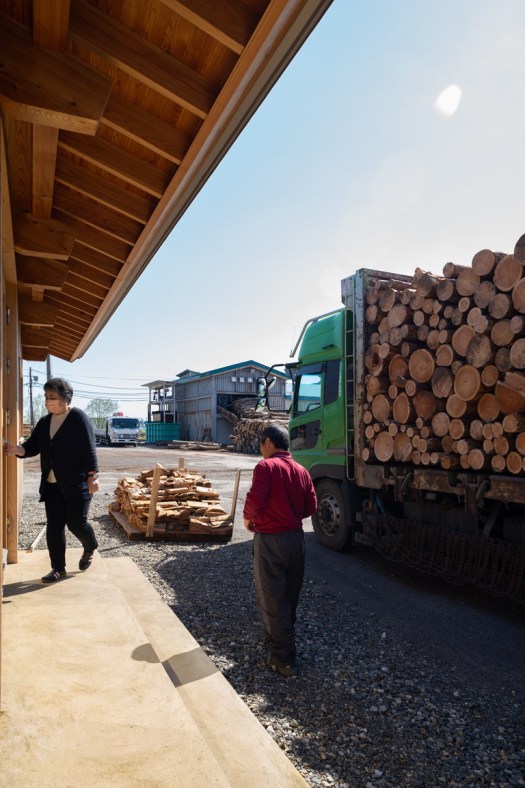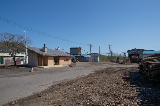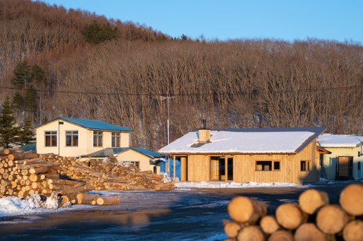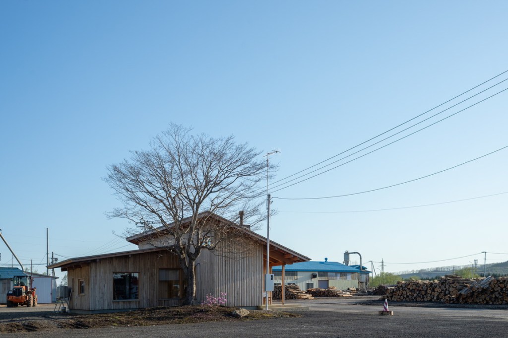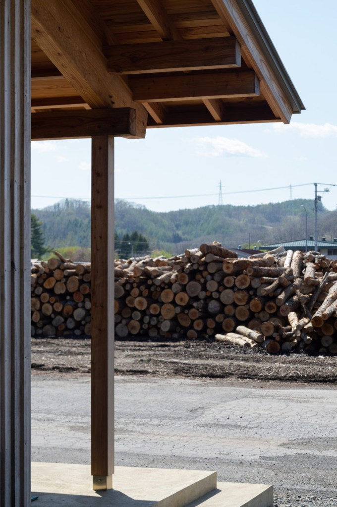 十勝・浦幌町でまもなく創業100年をむかえる木下林業。針葉樹、広葉樹を問わず、建築用製材からチップの製造まで行っています。新社屋の建設にあたり社有林から樹齢54年のカラマツを伐り出し、中温乾燥をほどこして柱や梁を製材しました。カラマツはそのほかにも繊維状にして断熱材としたり、和紙や左官材に利用して仕上げ材としています。また、外壁材やフローリング材には、チップの原料となっている原木のなかから、チップにするには惜しいナラの原木を選り分けて利用しました。地域で産出する素材を有効活用しようとする木下林業の姿勢がまさに体現された新社屋です。
