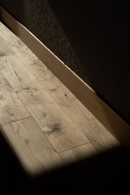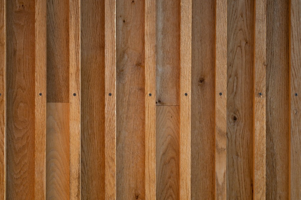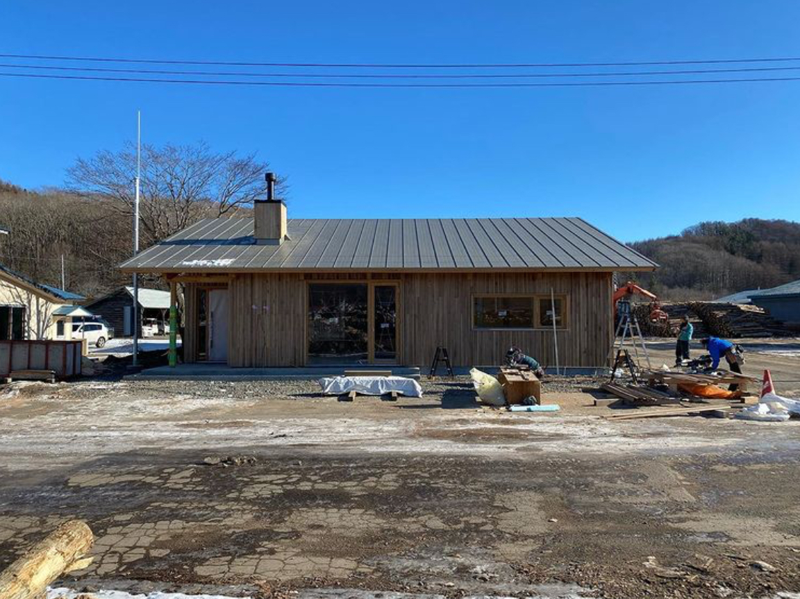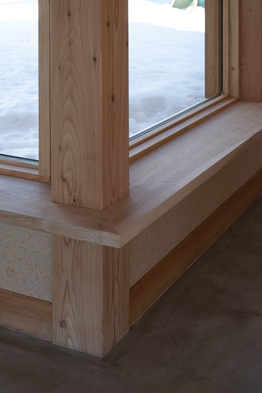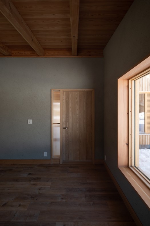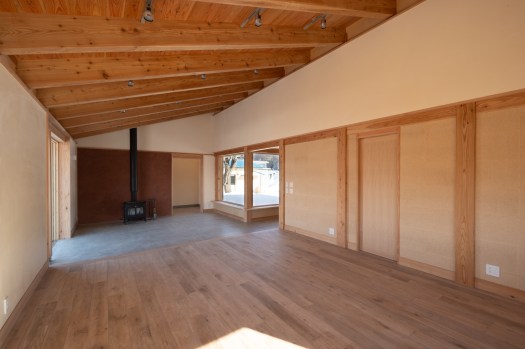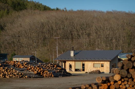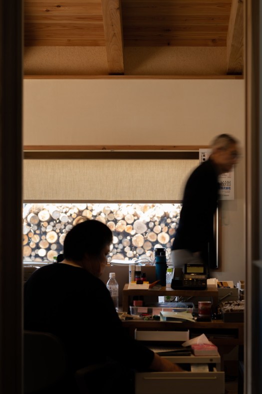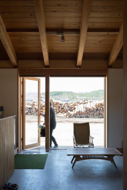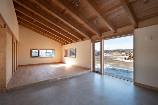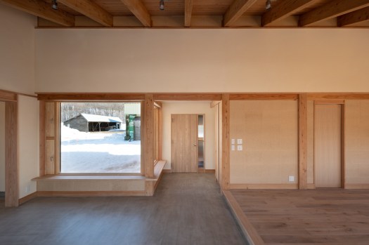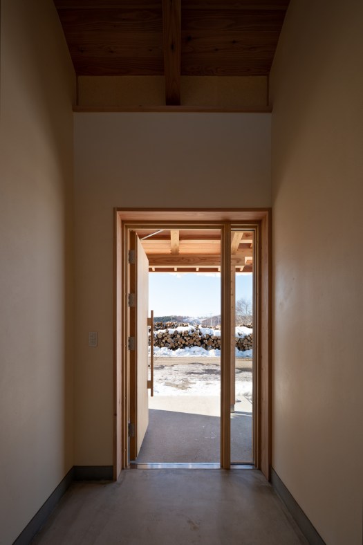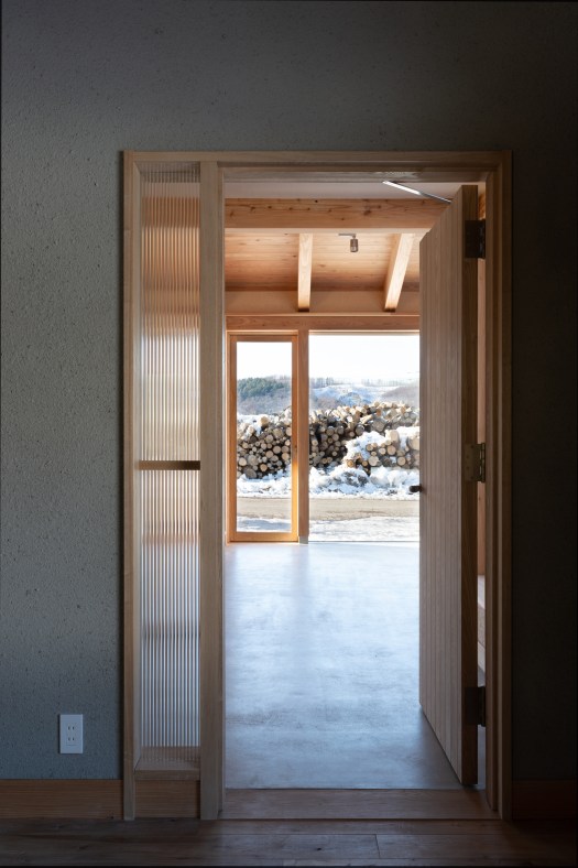 十勝・浦幌町でまもなく創業100年をむかえる木下林業。針葉樹、広葉樹を問わず、建築用製材からチップの製造まで行っています。新社屋の建設にあたり社有林から樹齢54年のカラマツを伐り出し、中温乾燥をほどこして柱や梁を製材しました。カラマツはそのほかにも繊維状にして断熱材としたり、和紙や左官材に利用して仕上げ材としています。また、外壁材やフローリング材には、チップの原料となっている原木のなかから、チップにするには惜しいナラの原木を選り分けて利用しました。地域で産出する素材を有効活用しようとする木下林業の姿勢がまさに体現された新社屋です。