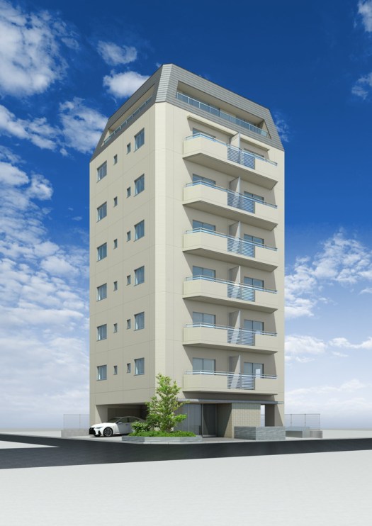 都市部の密集地に建つ共同住宅。建物の規模に対して狭隘な敷地のなかで、居住スペースの確保と建物の整形化の両立を目指し、天空率を駆使して試行錯誤を繰り返しました。喧騒の真っただ中にあっても、住まいとしての快適性は大切に考えたい。目下、仕上工事の真っただ中。