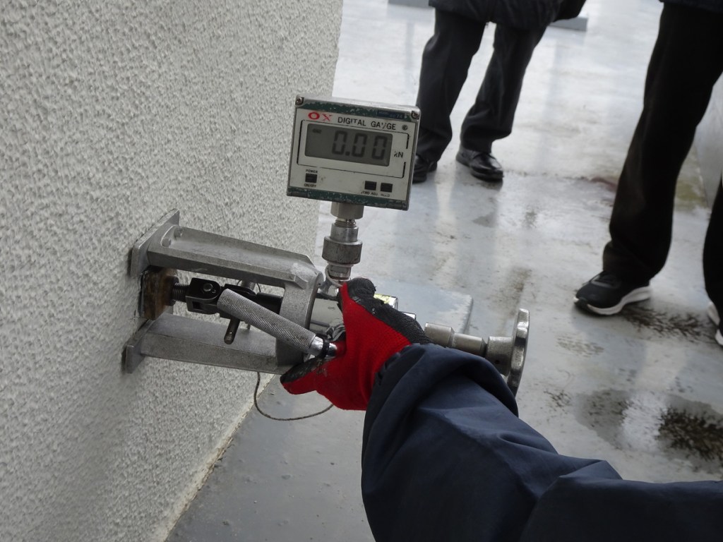 40mm角のステンレスの板を外壁に張り付け、それを引っ張り取るときの強度を測定して、既存塗材を剥離する必要があるかどうかを判断します。