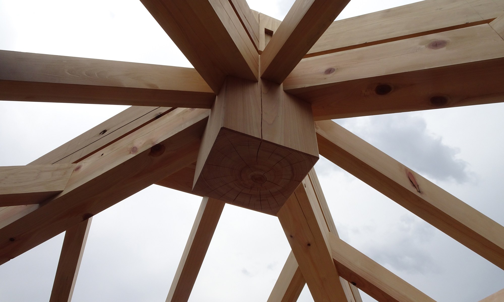 屋根の形は正方形の屋根伏せにあわせ方形とし、架構は渡り腮構法、小屋裏壁は板倉(壁倍率0.7倍)で組んでいる。