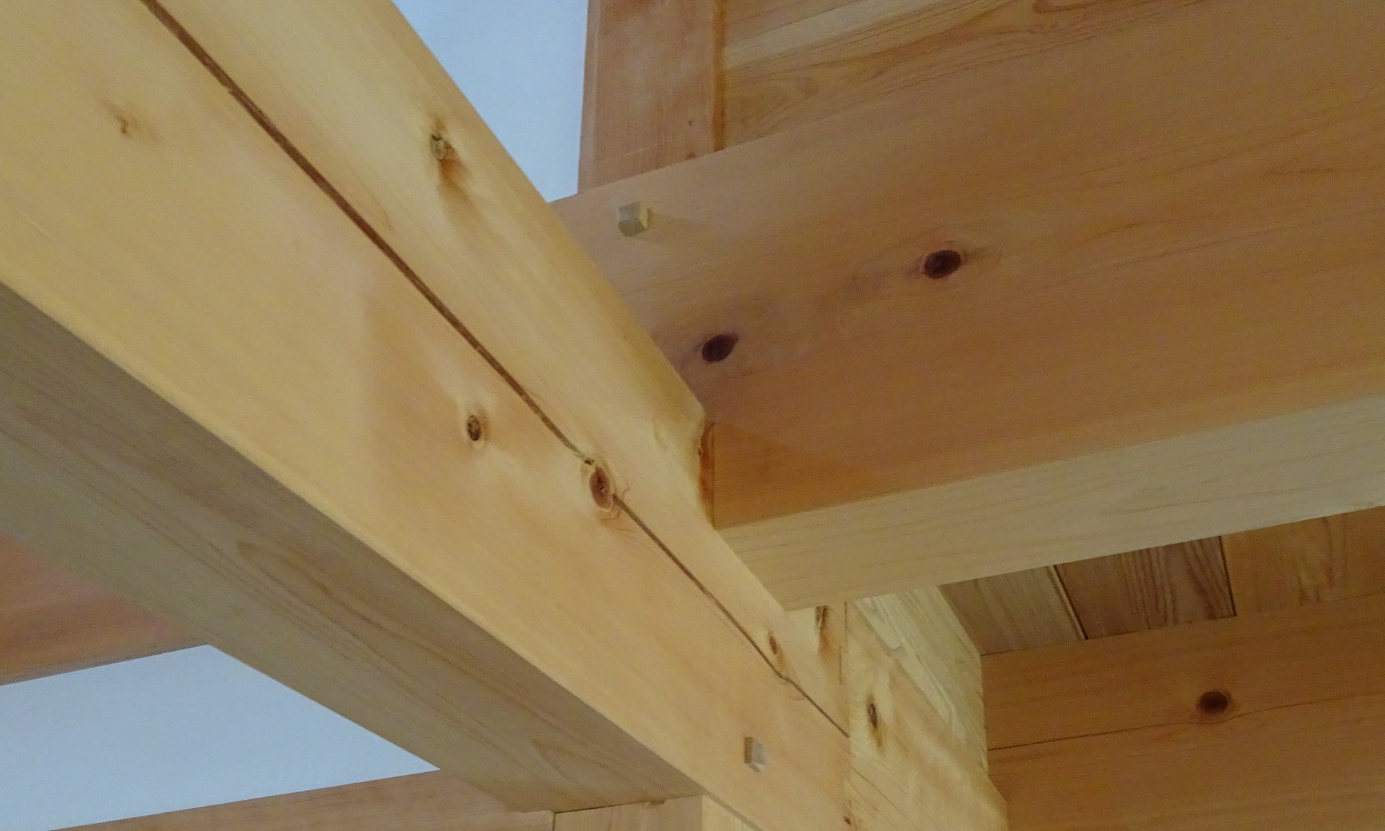 渡り腮(あご)構法 割れ、反り、ねじれ、収縮。 木の厄介さを受け入れる構法が安心感を生む。 渡り腮構法は、梁と梁を渡り腮で組んだ軸組に、耐力壁や水平構面などの構造要素を統合した木の構造システムです。 渡り腮とは、下の木に上の木を載せかけた木の組み方のことで、それ自体は、法隆寺の妻室(つまむろ)にも見られるように古くからある木の組み方のひとつです。その渡り腮を基本の構造要素として位置づけ、現代の構造的知見に照らしながら、建築物全体をつくるための具体的な設計法としてまとめたのは、丹呉明恭さんと山辺豊彦さんの二人です。二人の共著「渡り腮構法の住宅のつくり方」(建築技術)という本を通して私はこの構法と出会いました。渡り腮構法は、梁と梁を渡り腮で組んだ軸組に、耐力壁や水平構面などの構造要素を統合した木の構造システムです。 梁と梁を接合する仕口に渡り腮を選ぶ理由は、鉛直荷重の伝達に安心感があるからです。木材は「動く」材料です。不均質な材料で、乾燥収縮により縮み、反り、ねじれ、また、割れます。地震時の「動き」も大きく、鉄筋コンクリート造などと比べると接合部に生じる変形が大きくなるのも特徴です。渡り腮は梁と梁を大きくまたぐようにして組むため、動きに対して許容できる巾が大きい納まりと言え、そのことが安心感を与えてくれます。木という材料の特性を理解するにつれ、渡り腮構法が「木に従う構法」であることを実感します。 渡り腮構法で採用されている技術のなかには、古くから伝わる技術もありますが、あらたに考案された技術もあります。両者に共通するのは木の特性に従って木を扱うという合理性を追求している点です。私はこの点に強い魅力を感じています。それは、古く固定化した技術の繰り返しではなく、木の特性に従うという合理性を自らにも常に問い続ける姿勢が、この構法を広く開かれた技術たらしめていると思うからです。そして、私自身もこのような姿勢で設計に取り組み、実践していきたいと思っています。 <トピックス>にもどる☞