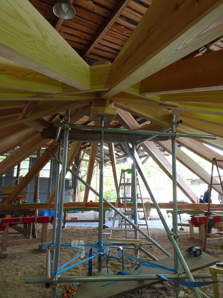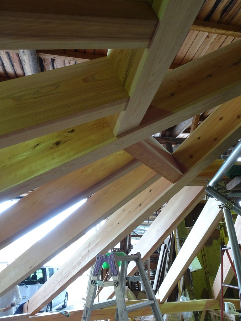 方形の家の屋根を施工してくれた大工の村上さん(村上建築工舎)が八角の屋根を刻んでいると聞き、仮組みの様子を見に飯能へ行ってきました。
