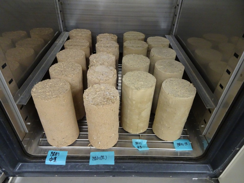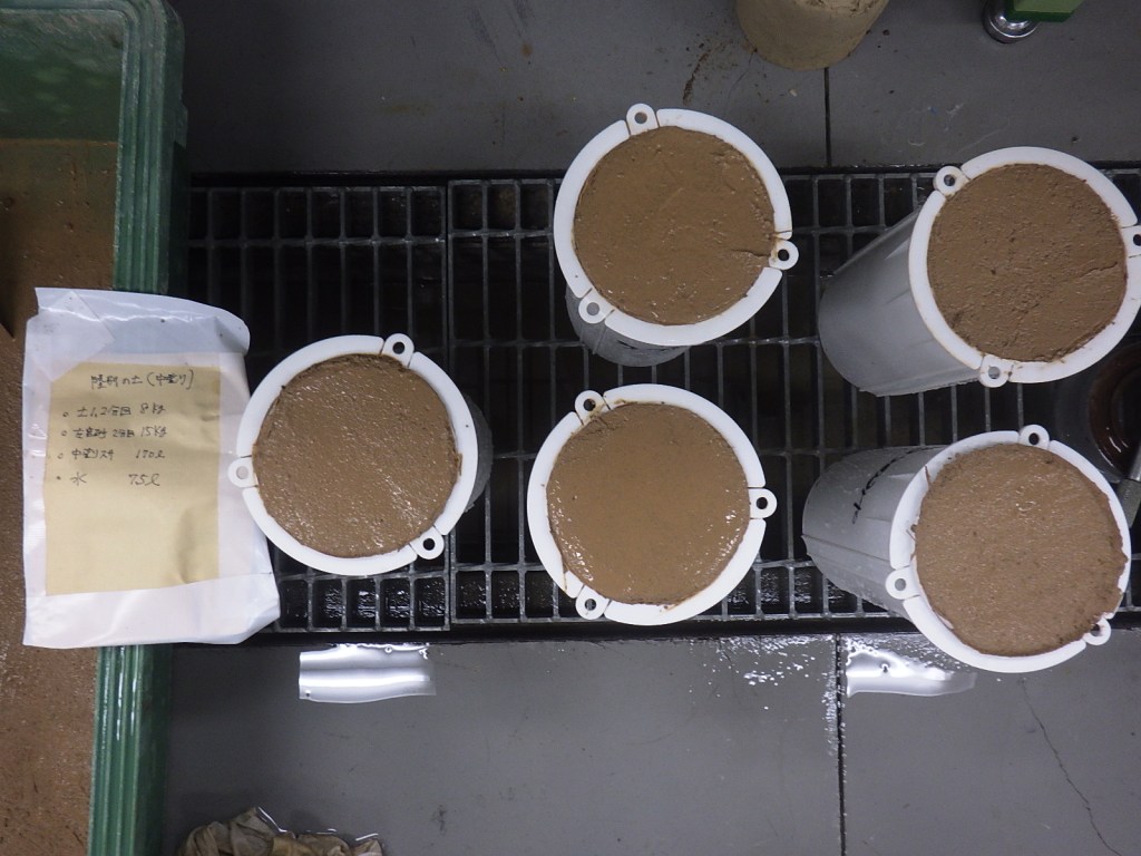 この写真は2月中旬に撮影された試験体製作の様子。もう乾燥も進み試験のできる状態になっているはずです。円筒形の型枠に材料を詰めて乾燥させるのは、コンクリートの圧縮強度試験と似てますね。