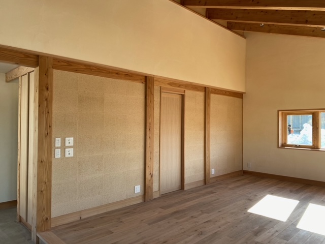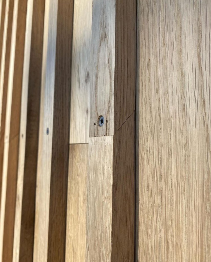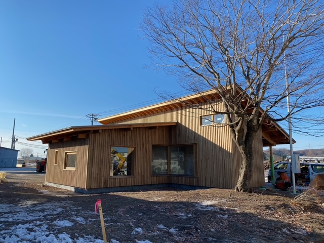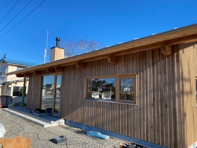 ナラの外壁をすべて張り終え、足場が撤去されました。ナラのずしっとした感じと、目板のサラサラとした感じがかみ合って良い雰囲気。