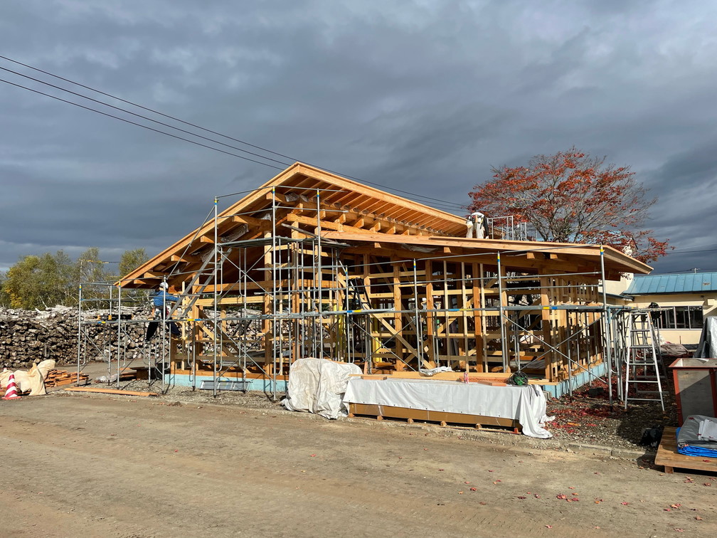 大工さんから写真が届きました。雨雲にせかされながら断熱材を敷いて、ルーフィングまで。